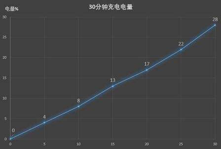 30分钟充电测试指:在手机电量为0的情况下,关闭所有后台应用进行30分钟充电,每5分钟记录一次电量。下面,我们看一下续航测试结果: