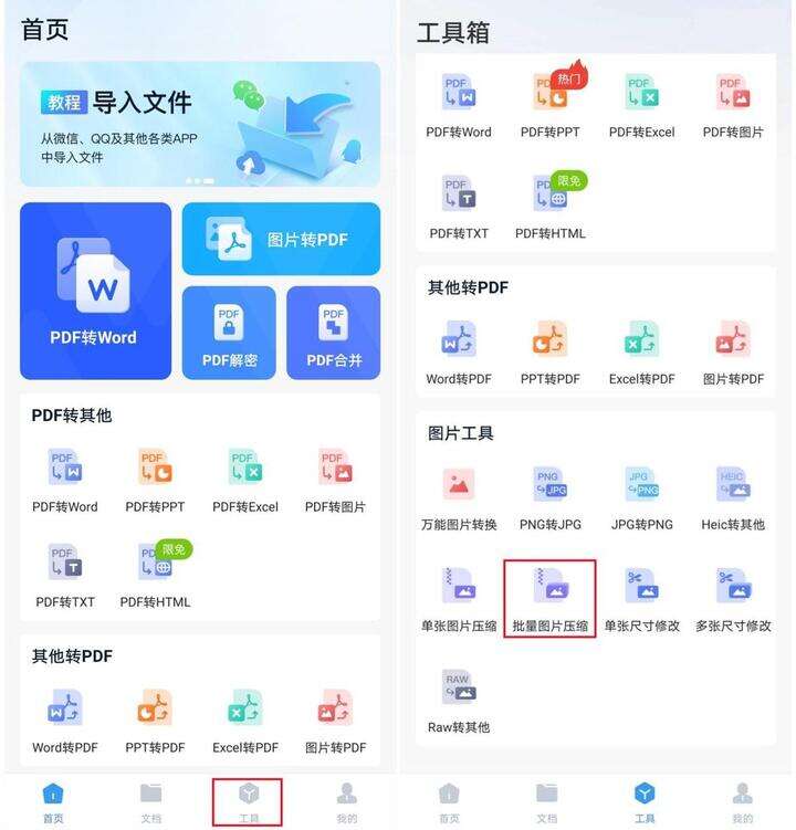 ①打开软件后,点击【工具】并下滑找到【批量图片压缩】功能按钮,点击该按钮上传需要压缩的图片。