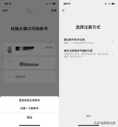 这时候选择[注册一个新账号],映入眼帘的是[通过新手机号注册]与[通过当前微信号辅助注册]两个选项,在选择后者后需通过正常微信注册步骤以及当前账号所绑定的号码验证,在设定好账号昵称与头像之后完成注册,无需绑定新手机号。