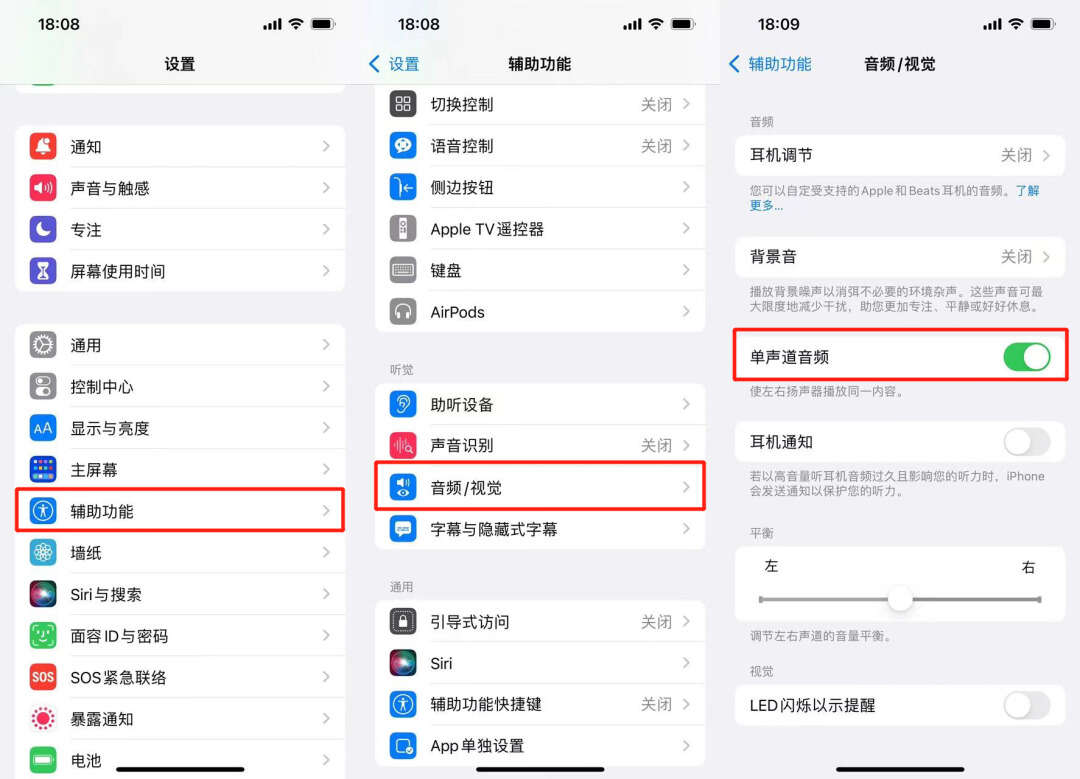 我们只需要打开设置 - 辅助功能 - 音频/视觉,进入后将“单音道音频”和“电话降噪”开启,就能改善很多。
