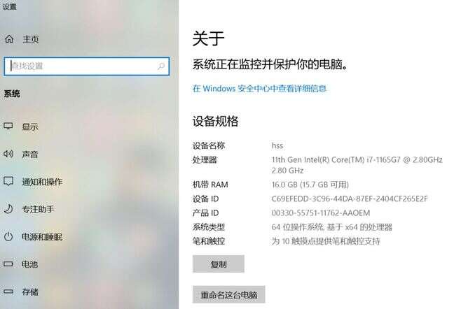 在这里我们可以查看到处理器的规格、频率以及内存大小,有些用户购买了笔记本之后会去额外加装内存条,通过这种简单的查看配置方式,可以看到内存是否已经成功安装被系统读取。