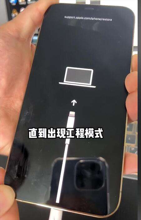 第二步,先将我们的苹果手机关机,用数据线将它和电脑连接在一起。接着按住关机键不松开,手机屏幕出现苹果手机logo后也不要松开,直到出现一个数据线+小箭头+电脑屏幕这个图案的时候,再松开。这个时候,我们看一下电脑端页面:设备连接成功,已经进入到了恢复模式。