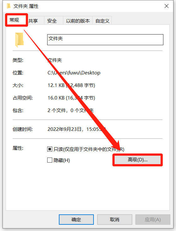 1、右键点击文件夹选择“属性”,在属性常规窗口中点击“高级”。