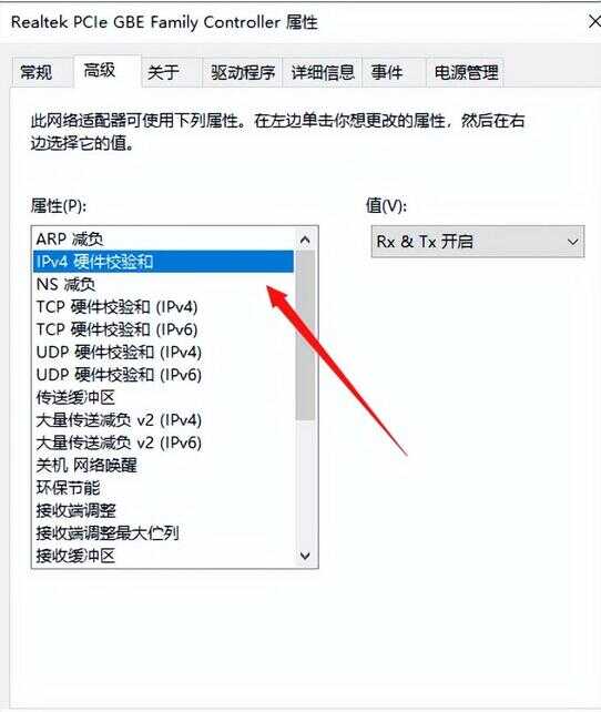 5、在高级选项页面的 属性 列表中选中“IPV4硬件校验和”(英文名:IPv4 Checksum Offload)。
