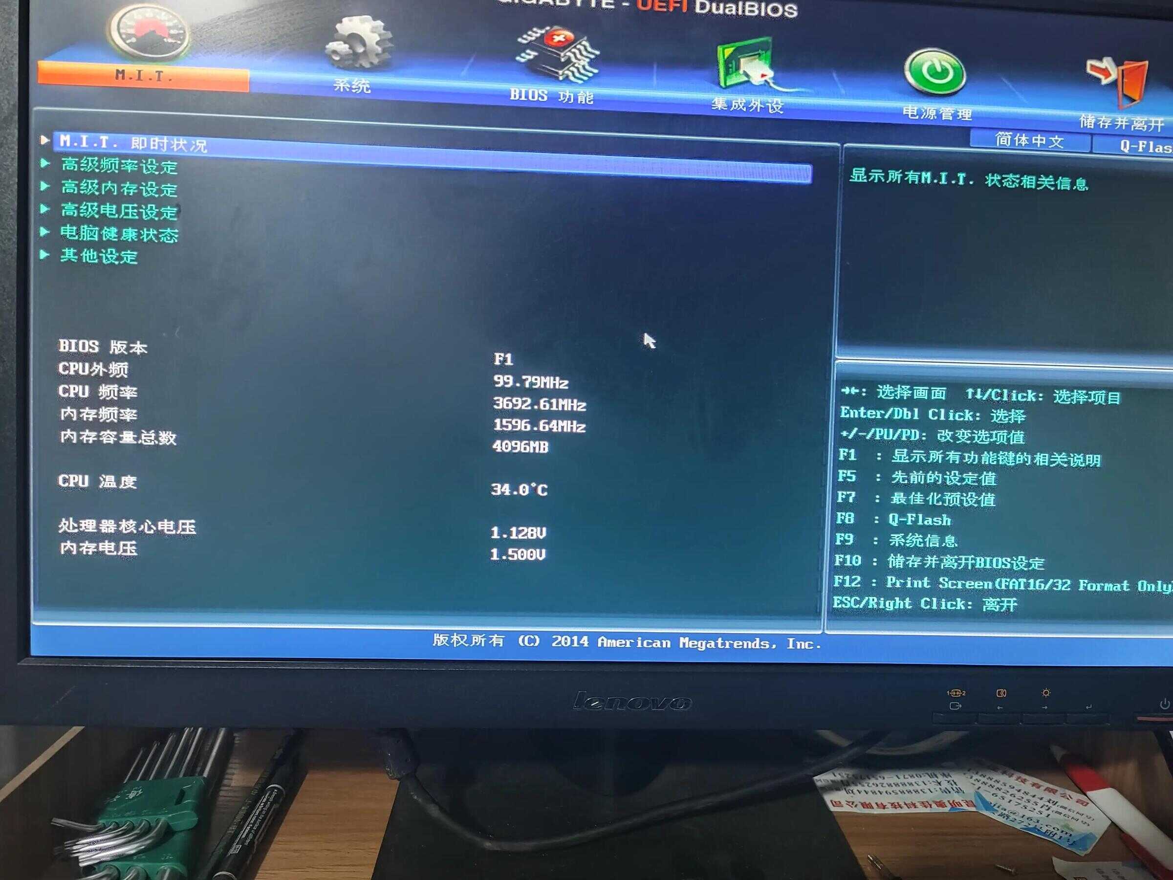 1、随后就会进入BIOS界面,在该界面我们需要了解以下几个重要的操作方法:通过键盘上的方向键进行光标移动;回车键表示“确定”;F10表示“保存并退出”。具体以BIOS界面上的说明为准。如图所示: