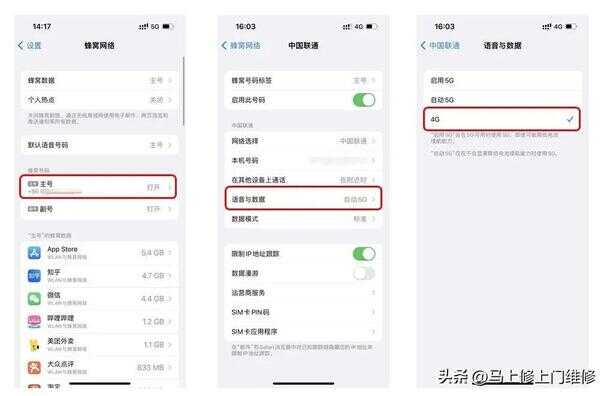 【设置】- 【蜂窝网络】-【选择号码】- 【语音与数据】-【4G】