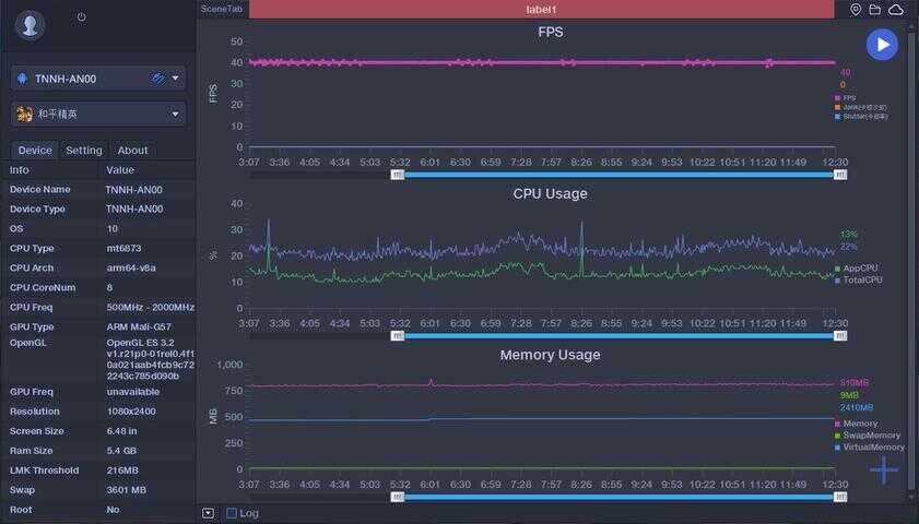 再测试的游戏是《和平精英》,同样使用检测软件来记录手机的运行情况,游戏开启HDR高清和超高帧率画质,通过曲线我们可见游戏全程保持在40FPS的最高帧数下运行,同时游戏占用处理器最低只有13%的资源,相比上一个游戏有着更低的资源占用率,同时运行内存只使用800MB左右。
