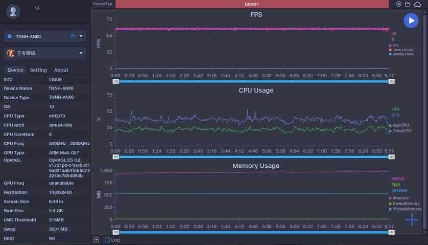 使用荣耀Play4进行游戏实测,在测试的过程中使用软件实时监测手机运行情况,在使用荣耀Play4运行《王者荣耀》时,我们将游戏画面设置为了超高画质,并开启了高刷新率模式。我们发现游戏的全程都在60FPS左右运行,帧率曲线的波动范围在1帧以内,由此可见荣耀Play4以满帧状态畅玩运行《王者荣耀》可谓是毫无压力。