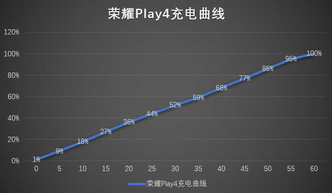 荣耀Play4使用了一块4300mAh的大电池,支持22.5W闪充,实际充电测试使用荣耀Play4的原装充电插头,通过充电曲线我们可见,其5分钟能够给手机充至9%左右的电量,10分钟充至18%左右的电量,30分钟能够给手机充电52%,60分钟将手机电量充至100%。