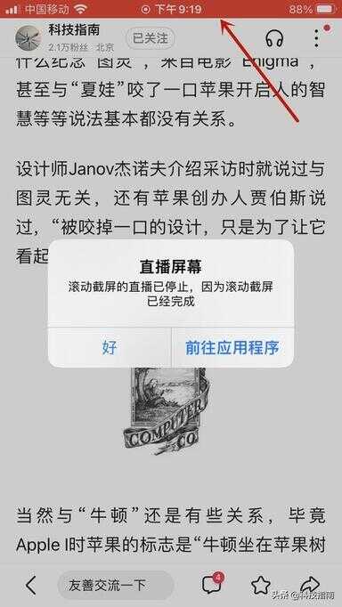 例如,笔者打开一篇文章,上下滑动,手机就在滚动截屏就在录制屏幕,上部状态栏会变成红色,点击一下,稍等一下弹出提示框。