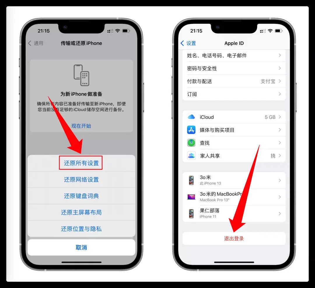 如果你需要去除烦人的系统设置小红点标记,安装屏蔽更新描述文件后只需两步即可实现,第一步还原系统设置,第二步退出Apple ID账号重新登录。