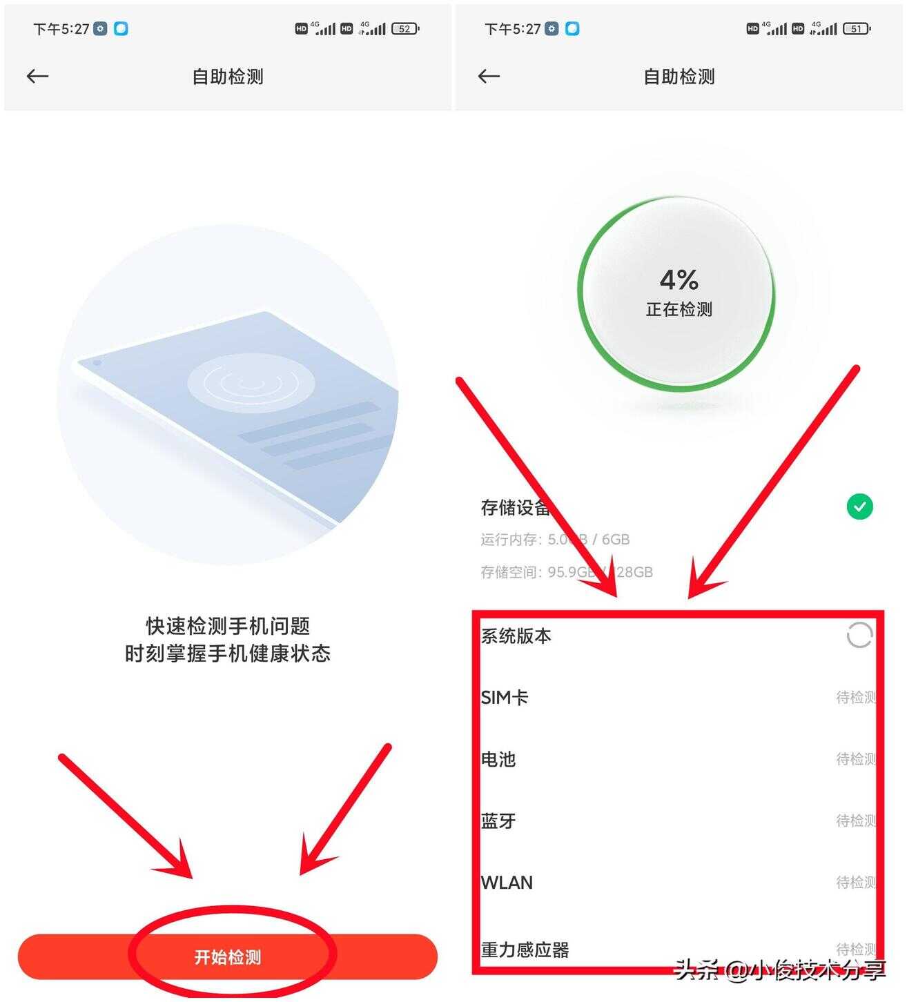 我们只需点击【开始检测】,此时手机就会自动帮我们检测手机上的各项性能和开关按键等等,等待检测完成,我们就可以快速知道哪些硬件和性能存在不足或者有问题的,只要发现有问题那就可以确定这个手机不是正品或者说是使用过的机器了!