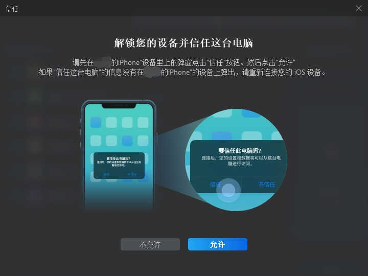 在电脑上下载并安装iTunes。将您的2部iPhone/iPad都用USB线连接到计算机,点击「信任」按钮继续。