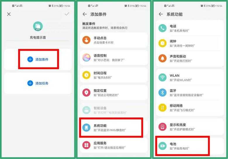 ②进入编辑界面,点击【添加条件】,进入【系统功能】-【电池】界面;
