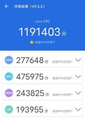 除了上面提到的配置,vivo X80内置4313mm2超广域冰原散热,完全可以称得上是旗舰机的水平,更强的散热性能有助于充分发挥硬件性能。而在安兔兔综合跑分测试中,vivo X90达到了将近120万分的好成绩,读写速度表现也很不错,这也完全达到了目前智能手机的第 一梯队。