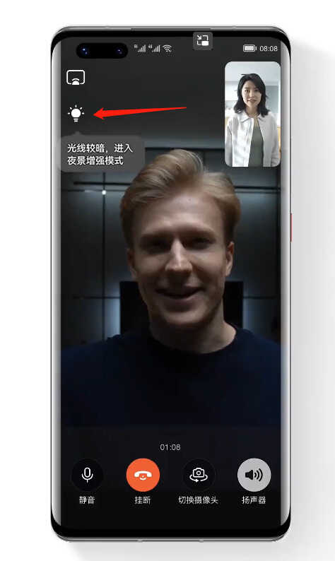 暗光增强:在夜间通话时,畅连可自动识别暗光场景,开启“小灯泡”后将自动补光。即使身处弱光暗光,也能随时随地闪耀你的美。