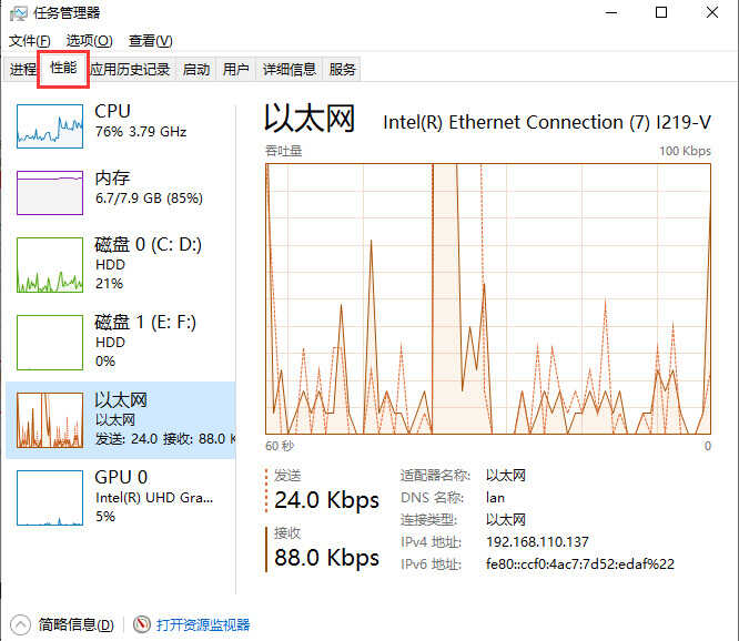 进入任务管理器后,点击【性能】—【以太网】,实时查看电脑的网速情况。