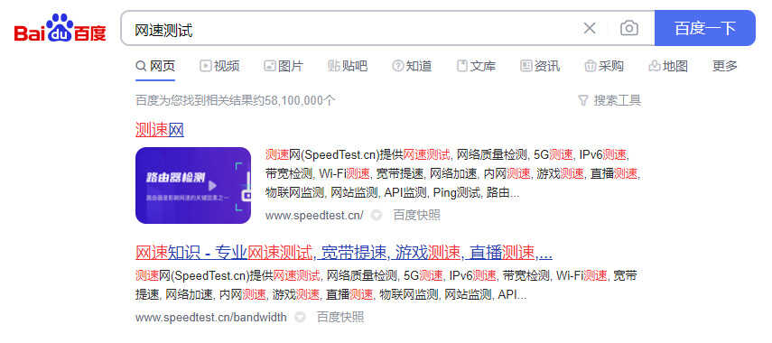 我们可以在浏览器的搜索页面输入【网速测试】或者【测网速】等关键词,在搜索结果中点击排名第一的网站,这个网站是比较常用的。