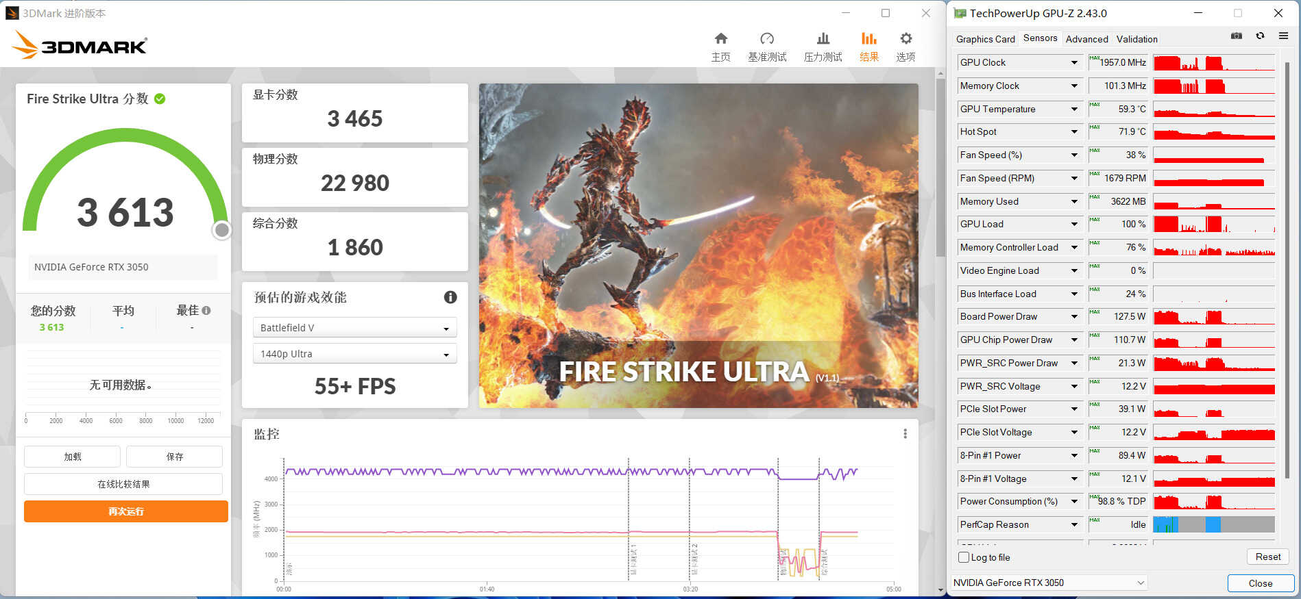 在3DMark FireStrike Ultra(4K渲染)测试中,七彩虹RTX 3050战斧的图形分数达到了3465分,核心温度最高59.3℃,Hot Spot最高可达71.9℃,核心运行最高频率为1957MHz,最高风扇转速1679RPM,GPU最高功耗127.5W。