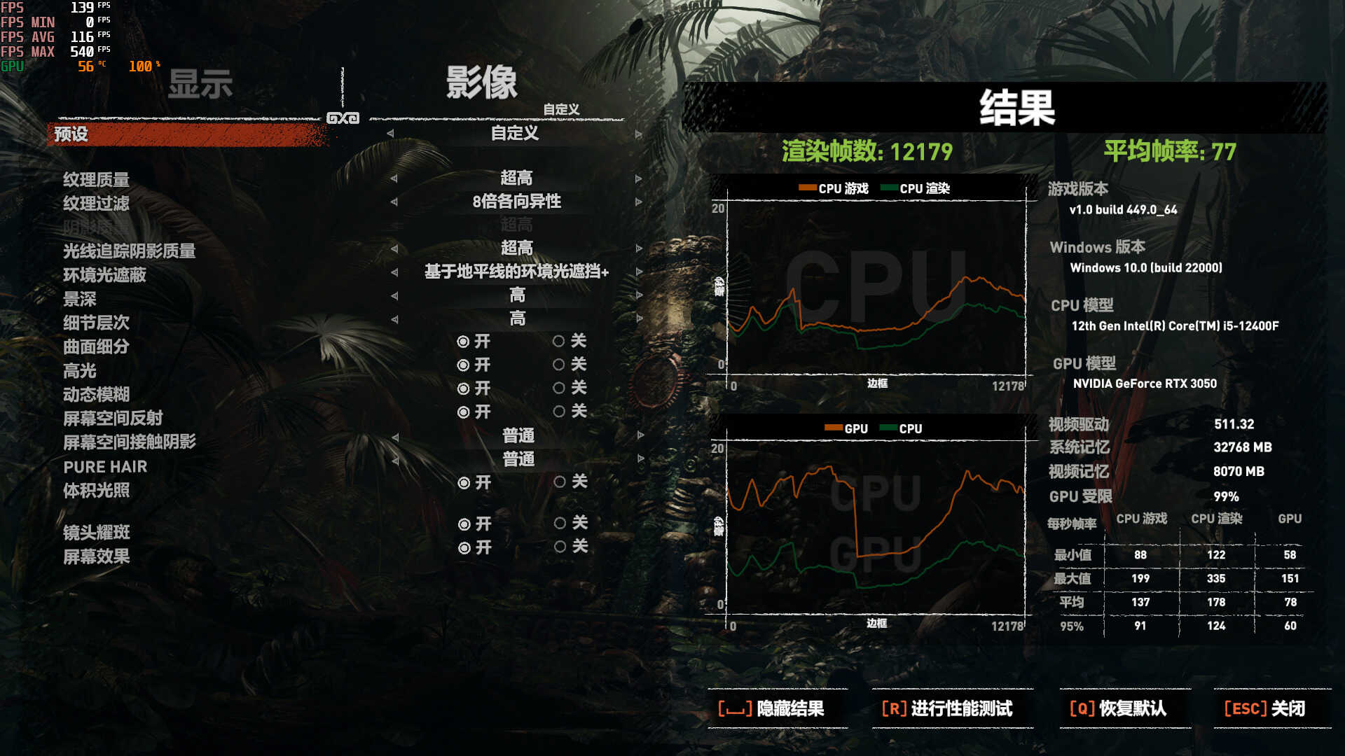 同时开启DLSS(质量)和RTX(超高)之后,帧率回到了77FPS。