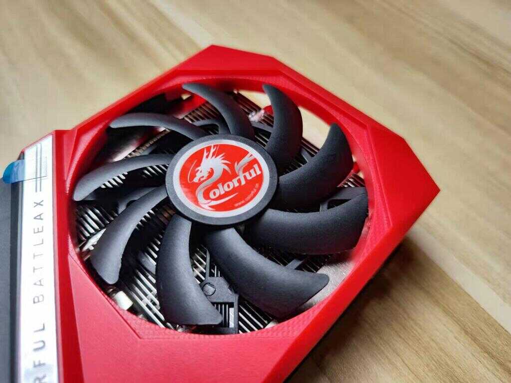 这张七彩虹战斧RTX 3050 DUO显卡沿用了七彩虹“战斧”系列的传统设计,显卡正面采用红黑撞色设计,塑料面板多少有些廉价感,正面配备了2个直径为90mm的刀刃式风扇,左右风扇采用逆时针、顺时针旋转,增加显卡空气对流,可以带给散热器更多的散热气流。