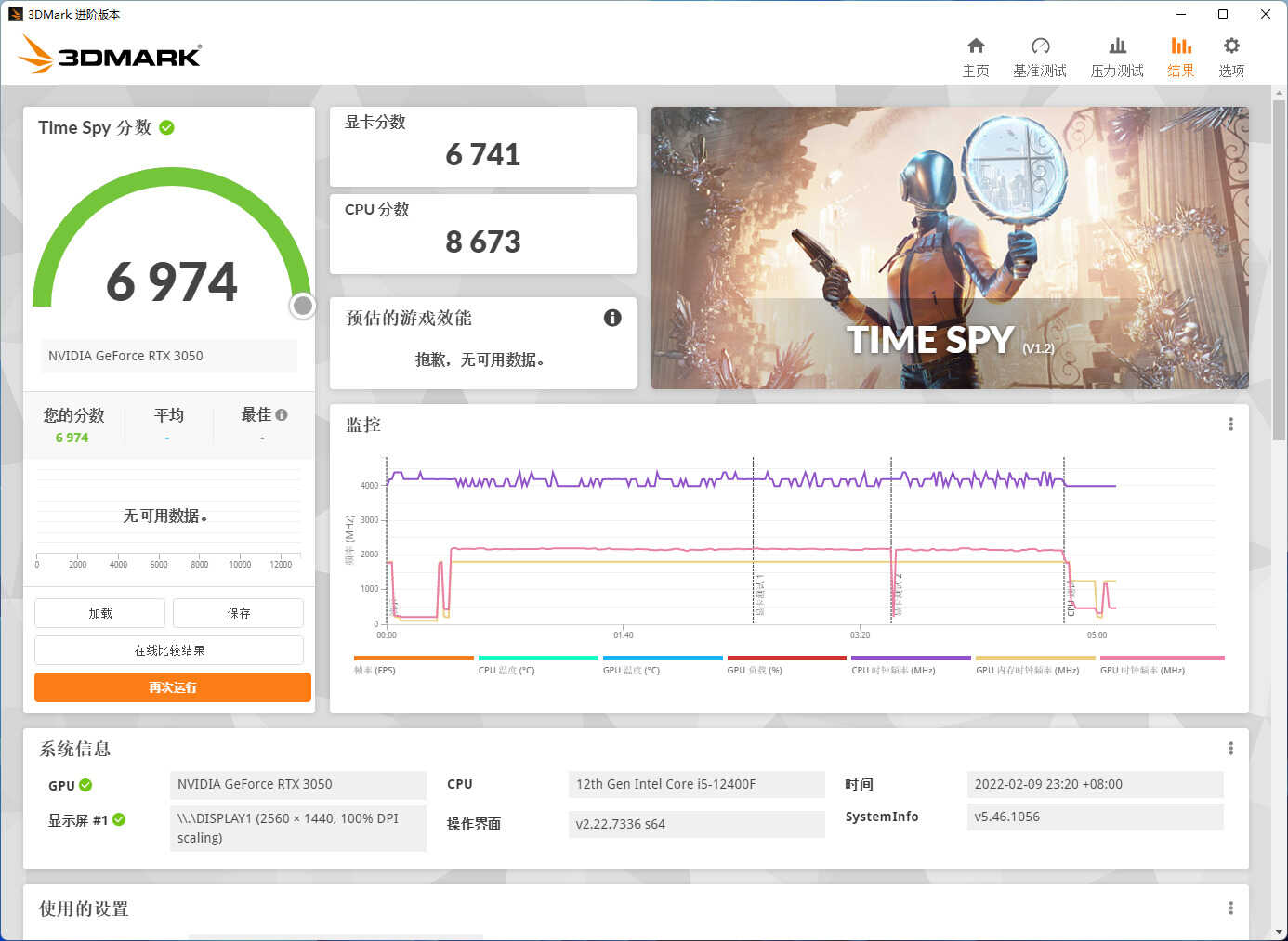超频之后,3DMark TimeSpy的图形分数6741分,这相比默频时的6236提高了505多分,提升幅度接近10%。