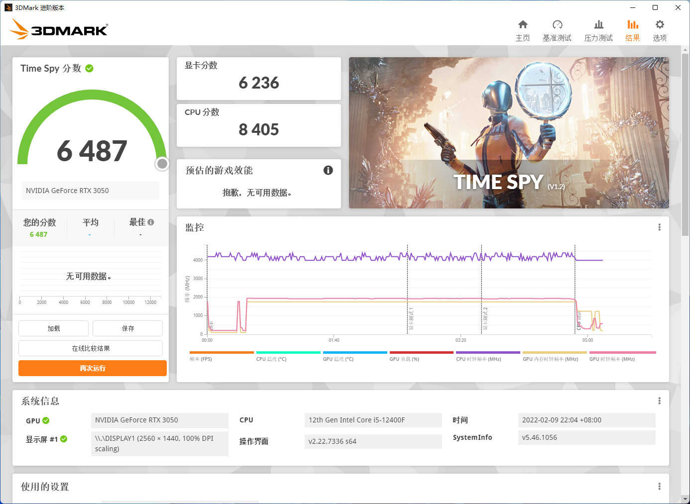 在3DMark Time Spy(2K渲染)测试中,RTX 3050战斧Duo图形分数达到了6236分,核心温度最高60℃,Hot Spot最高可达73度,GPU最高功耗127.5W,核心运行最高频率为1950MHz。