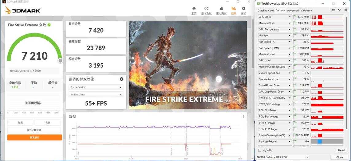 在3DMark FireStrike Extreme(2K渲染)测试中,七彩虹RTX 3050战斧的图形分数达到了7420分,核心温度最高59.5℃,Hot Spot最高可达72.6℃,核心运行最高频率为1957MHz,最高风扇转速1699RPM,GPU最高功耗127.5W。