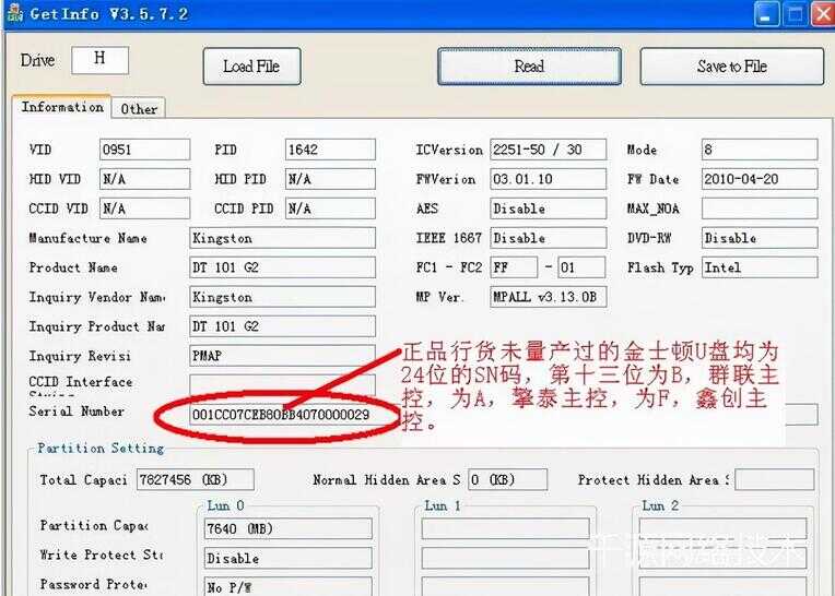 先通过芯片精灵读出设备序列号,然后再用主控检测工具读出SN只要是正品行货没有进行人为量产,其SN码必定是24位的,量产过的其SN会变成16位。