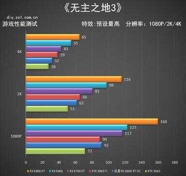 在《无主之地3》中,我们选择预设最高的恶棍画质,RX 6600 XT在2K和4K分辨率下依然被RTX 3060 Ti超过,但综合RX 6000系列来说,保持了比较统一的分数差距。