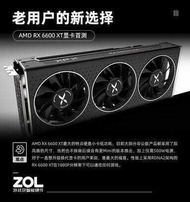 另外根据官方公布的硬件参数和介绍来看,RX 6600 XT适用于1080P电竞,也就是可以在1080P分辨率下达到高帧率电竞级别的水准。而这张卡的定位,则是整个RX 6000系中的入门级产品,功耗只有160W,500W电源即可,能够较好地兼容上一代玩家的电脑配置。