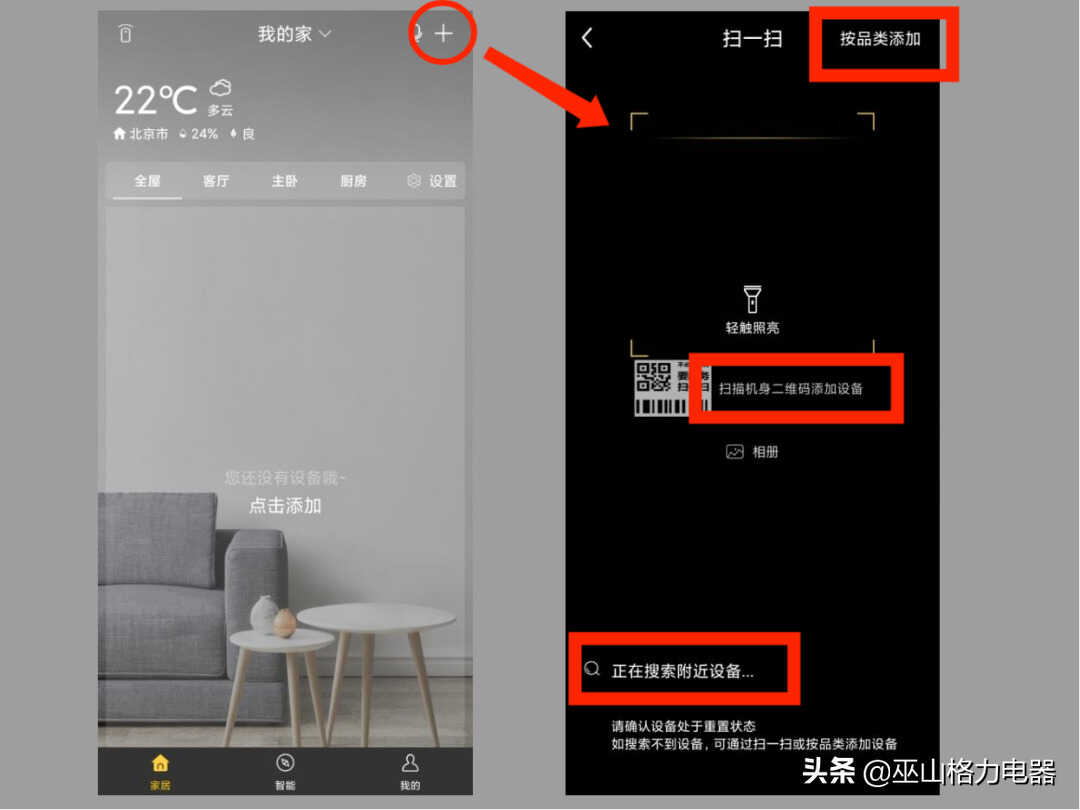 - 通过3种方式任意一种进行配网:搜索附近设备、扫描机身二维码或按品类添加设备