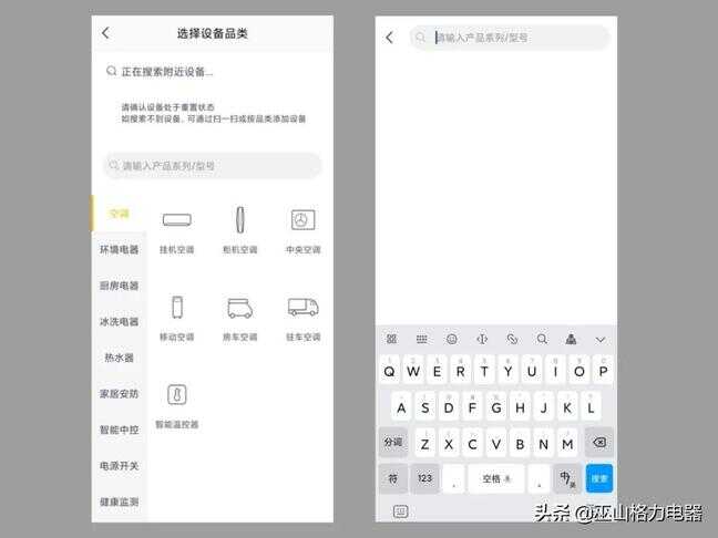 进入选择设备品类页面,选择产品大类和型号,或直接输入搜索;