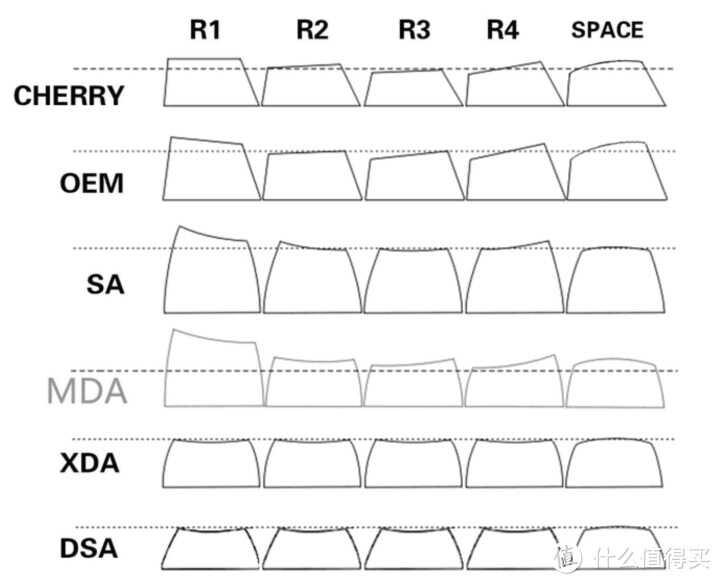 还有一种键帽是没有梯度的统一高度,这种键帽一般不会出现在成品机械键盘上,所以这里就不过多介绍了。关于更多键帽知识,可以看我之前发过的文章。