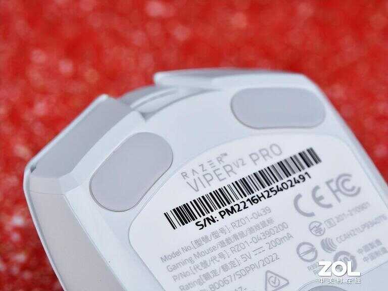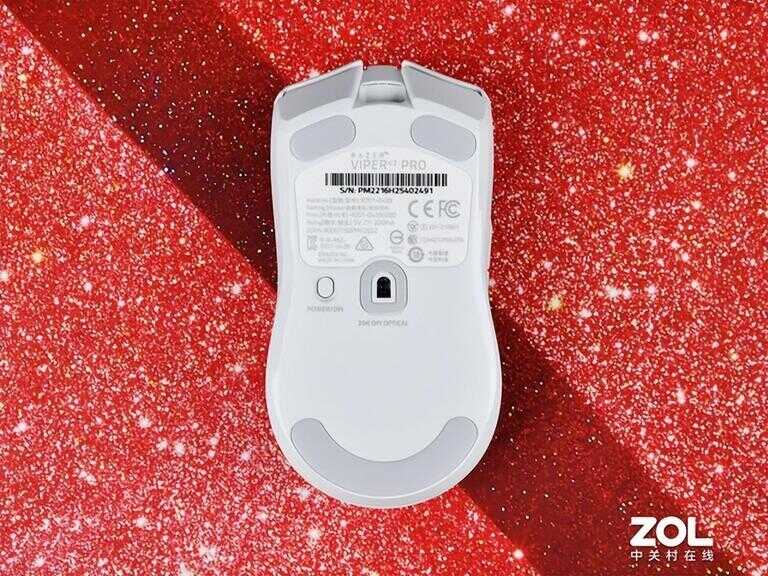 从外观方面来讲,雷蛇毒蝰V2专业版游戏鼠标的底部设计稍有变化。它去掉了2.4G无线接收器收纳槽和金属充电触点、电源开关和而DPI按键合二为一,我们可通过滚轮后方的指示灯颜色变化来判别鼠标的DPI档位。可以看出来是为了极致轻量化而作出的取舍。