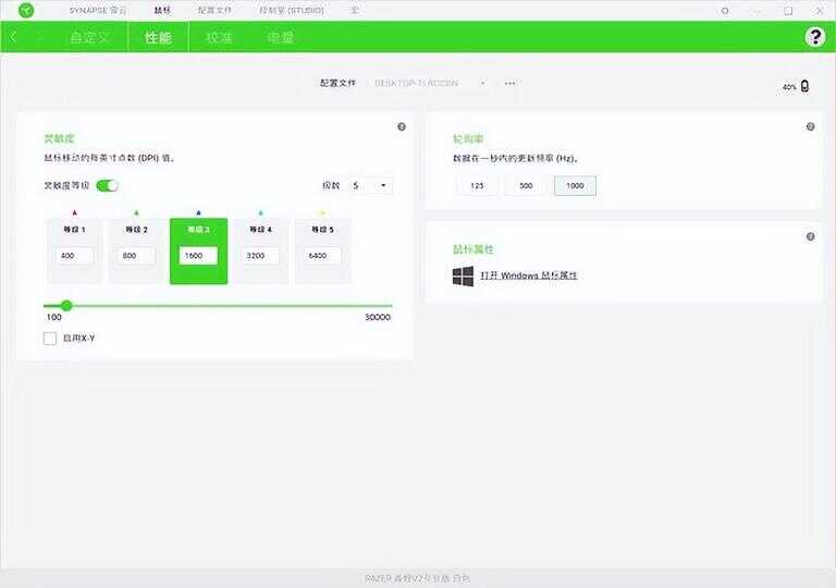 在“性能”界面中,我们可以对鼠标的灵敏度和轮询率进行更改。雷蛇毒蝰V2专业版游戏鼠标支持在100~30000DPI中以50DPI为步进调节分辨率,并最多可保存5档。而轮询率选项中则支持以125Hz、500Hz和1000Hz三档性能来运行,对应了鼠标不同的使用场景,用户按需选择即可。
