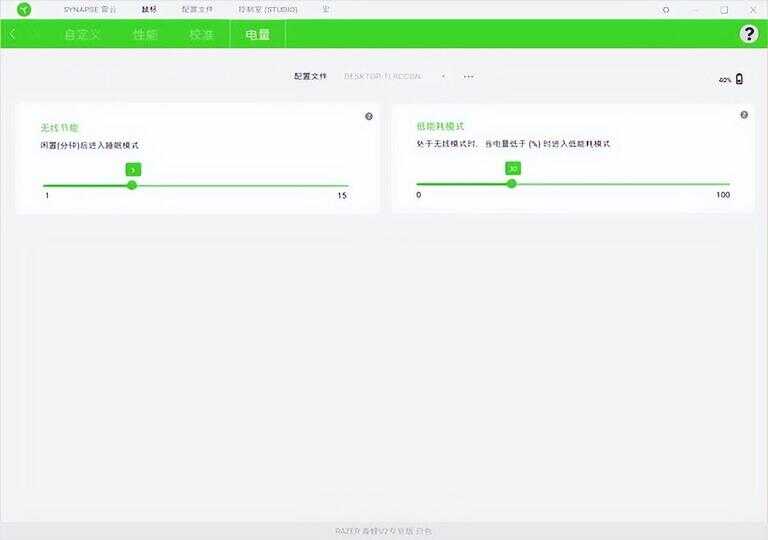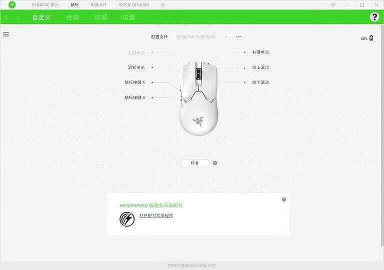 雷蛇毒蝰V2专业版游戏鼠标支持雷云3,可通过板载内存保存4组配置文件。这款驱动共分为4个部分,分别是:自定义、性能、校准和电量。