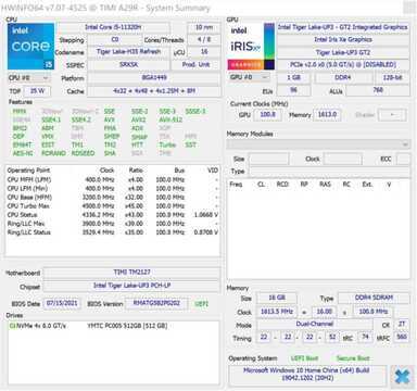 在台北电脑展期间,英特尔对整个TigerLake家族产品线进行了Refresh,而RedmiBookPro15增强版所搭载的酷睿i5-11320H、酷睿i7-11390H就隶属于H35家族;目前HWiNFO64已经可以识别出完整的处理器规格参数信息。