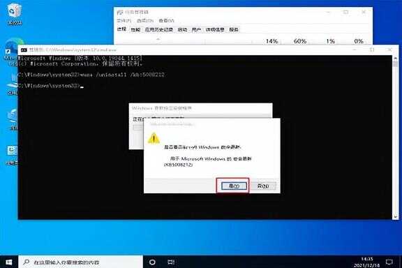 3.进入后,输入“wusa /uninstall /kb:500821”在弹出的窗口选择“是”,等待卸载完成重启就可以了。