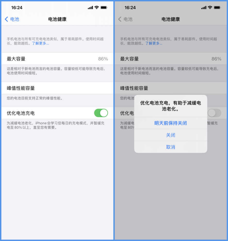 最后,别忘了在【设置】-【电池健康】中打开【优化电池充电】,这样可以缓解电池老化哦。