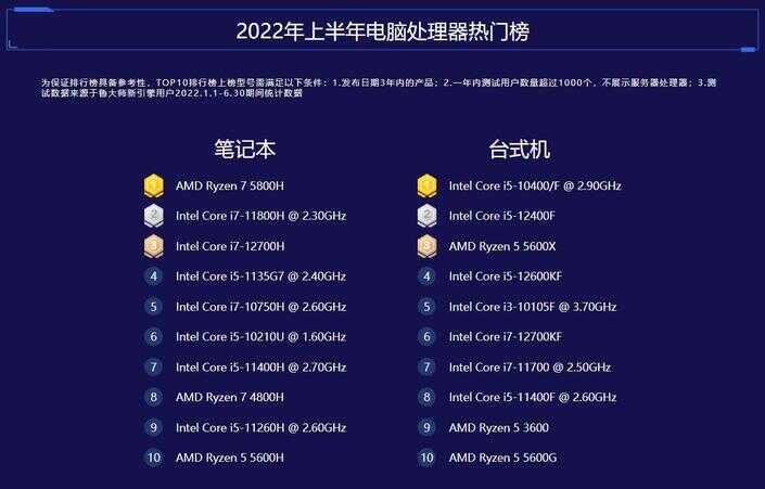 近日,鲁大师2022年半年报发布了PC硬件排行。排行数据包含2022.01.01—2022.06.30日鲁大师PC正式版测试数据。其中,PC处理器性能排行榜中,AMD依旧以王者姿势稳坐钓鱼台,任凭英特尔紧追不舍,依然拿下冠军。