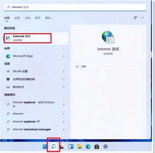 1、左下角搜索框内输入 INTERNET 打开INTERNET 选项。