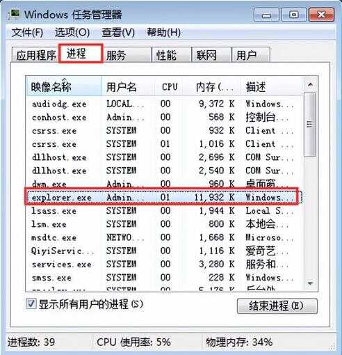1、打开任务管理器(Ctrl+Alt+Delete),点击“进程”选项卡,找到explorer.exe这个进程,如图所示: