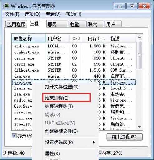 2、在explorer.exe上右键单击,选择“结束进程”,选择结束进程,如图所示: