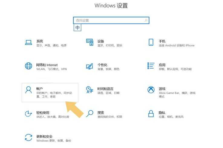 进入电脑系统“设置”界面以后,在弹出的界面里找到“帐户”。如下图: