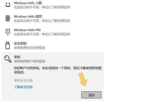 设置密码的方式和方法有很多,但部分密码的设置方法需要用户的电脑支持才可以,如果用户不懂,不要胡乱设置,直接点击“密码”选项,界面会自动弹出输入密码的窗口,然后选择“添加”。如下图: