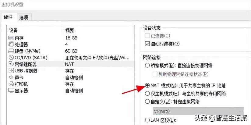 这项设置一般选择NAT模式,其余各种模式的区别设计一些网络知识,如果大家需要详解,后续我们会单独写一篇文章介绍。