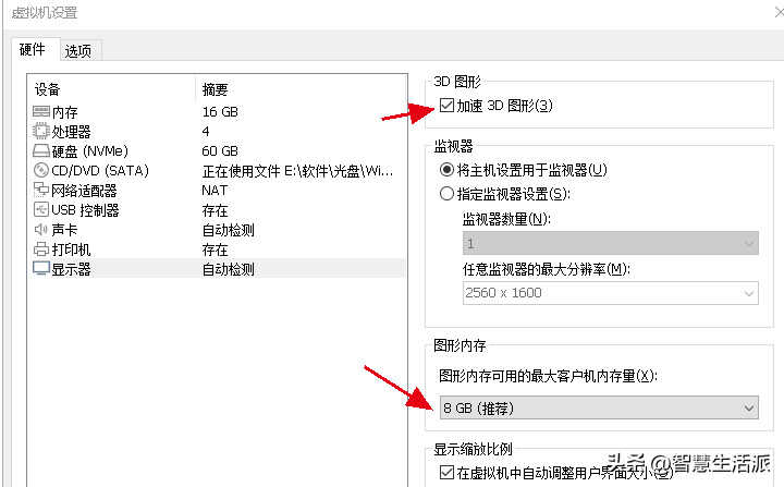 首先勾选“加速3D图形”复选框,以提升显示速度。关于图形内存,选择默认的容量就行。如果不玩游戏,一般512MB即可,若玩游戏可设置为1GB或以上容量。不过需要注意,这里的内存是从虚拟机内存共享的,设置过高会导致虚拟机内存不足引起卡顿或者报错。