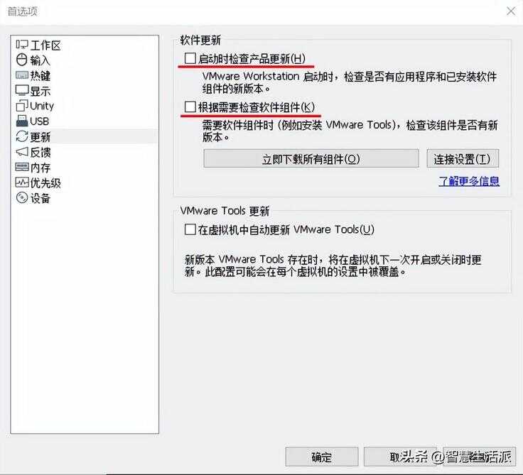 3、选择VMware菜单:编辑–>首选项–>更新,将”启动时检查产品更新“和”根据需要检查软件组件“两项取消勾选。