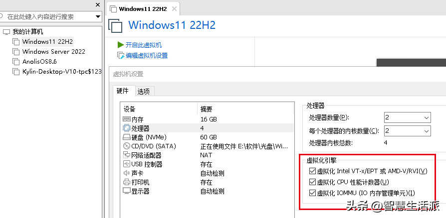 “虚拟化Intel VT-x/EPT 或 AMD-V/RVI(V)”、“虚拟化CPU性能计数器(U) ”,以及“虚拟化IOMMU(IO内存管理单元)”,根据自己电脑硬件情况酌情设置勾选,如果虚拟机启动报错,再次启动的时候取消相应选项即可。